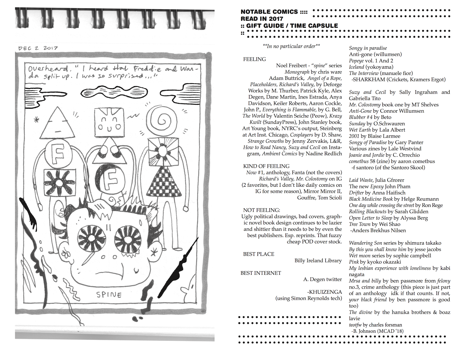 -In this book there's a lot of pain and chaos in Jesse's memory and in his family. He uses an ironic scheme to organize the story of instability--playful, peaceful objects like games and animals and toys. On another level, in the book there's the thing where you try to figure out who you are in relation to the Others you bounce off—family, friends—and who shape you, and it feels like he's trying to triangulate himself in relation to these other people. It can be a difficult process in the best of times, but especially when your family has troubles. As you grow older you try to figure out yourself in relation to abstract ordering schemes you read about, like in comics, philosophy, or what it means to be an "artist." In the "Fred Robinson story" the friendship and creative collaborative relationship between him and another guy grows organically around some arbitrary organizing devices, and it seems like those were good times. Late in the book he twice tells anecdotes in which there are organizing schemes which lead to him taking the position of “nothing” (in psychological testing + Greek numerology) or adopting the nickname "Nothing." This instinct to sublimate life into metaphors and symbols is responsible for the book itself, and is a recognition of new possibilities for coping. In the final story he uses the alphabet, and his calm, quiet—almost too quiet—cartooning style gets noisier and frantically layered. There's this feeling like the manic energy is straining to break through the ordered arrangement of the comics grid and the storytelling devices. I'm not sure how to read that change in style, in terms of what it is an expression of. [later addition: looks like it's arthritis.] It threatens to bring the whole house down around it, or become something other than an orderly comics page. It’s a fun style to look at, in the sense that there’s a lot of new psychedelic levels through which to look at the panels, but I don’t think you want to go too far down that path, or else the comic as a readable balance of mark-making and symbol will start to break down. There’s a lot of energy hidden, pent up, in Reklaw’s older normal “square” cartooning style, and it’s starting to bust out and become unpredictable, more like he is in person.