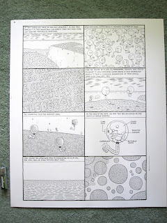 These are 2 pages I drew for the forthcoming Nobrow #6. The assignment was to do a story on the theme of doppelgangers or doubles. The printed pages will be in "two color" which means they will be in black and white plus one other color. Ganges-style. It may help you to see the way the final pages look after the photoshopping and text edits, and so you can see small versions of those here:
