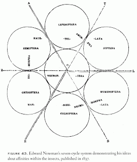 Another quinarian, “…Swainson devoted several years to the development of a new general classification of animals based on quinarianism, applying it, for example, throughout his two-volume Natural History of Birds that appeared in 1836 and 1837.” Imagine spending years on this. Imagine those wonderful days when everything seems to fit, and the frustration when they don’t. Notice, in the diagrams above, that three asterisks were placed where taxa that "had yet to be discovered.” The “ ule of five” predicts them, so they must be out there somewhere.