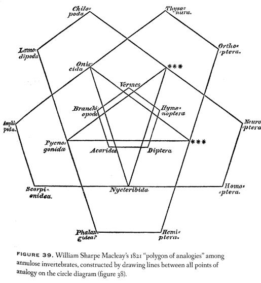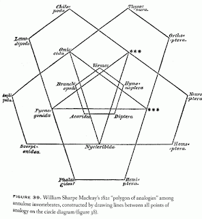 "…the so called quinarian approach to classification that was embodied in the work of British entomologist named William Sharpe Macleay (1792-1840) but taken up almost immediately by others, principally Nicholas Aylward Vigors (1787-1840) and William Swainson (1789-1855) during the 1820s and 30s. They somehow came to believe that living things existed in natural groups of five, that such groups of five are naturally divisible into five subgroups, each subgroup into five sub-subgroups, and so on. Affinities among taxa formed circular chains…Quinarians were also convinced that similarities between taxa based on affinity as well as analogy could be indicated in the same diagram…"