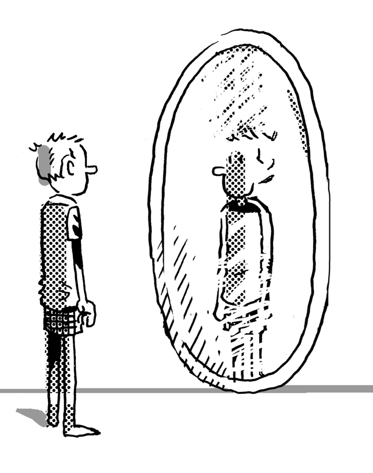 "Awakening, Glenn Ganges can sense where the 2D mirror ends and the 3D space he feels his body inhabiting. He looks into a mirror, fully aware of both what he is doing and what it means. "