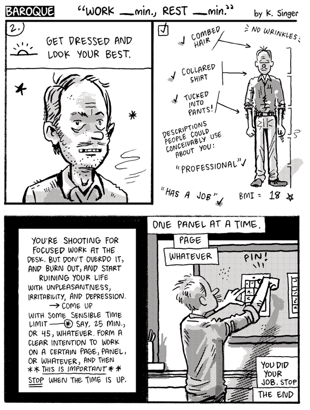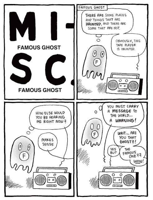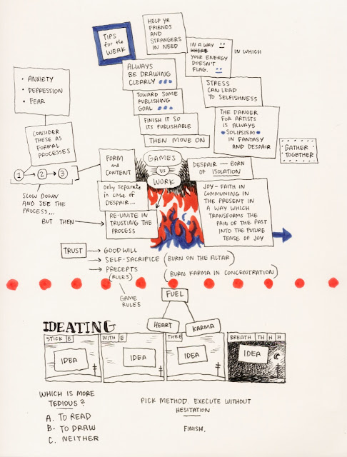 "...I think you should try thinking about clarity[...]A crucial place to focus is on your lettering. In your sketchbooks, copy typography that appeals to you, and approach your cartooning the way good typography is designed, balancing positive and negative spaces so that your panels "read" quickly and clearly. Cartooning can be thought of as graphic design, and as a typography of icons, or maybe just as having good handwriting, if your handwriting also includes a system of complicated emojis. In your sketchbooks try developing your own fonts—nothing fancy, just letterforms you like—and then play around with using them in non-sequiturs and to say offensive things, whatever gives them energy and keeps it interesting. Create your own "fonts" of imagery too–instead of drawing a character from scratch each time, create a system in which you limit poses and character sizes to a only a few standard sizes and views, then trace those into panels before customizing the figure to whatever the needs are of that particular moment in the story (e.g., Bushmiller, Neil Jam, Segar, etc.). Another recommendation is to use graph paper (e.g., G. Bell), or (I prefer this–>) paper with dots in a grid pattern (link). This will keep you on track with at least the horizontal and vertical lines. Grids are very important for clarity..."